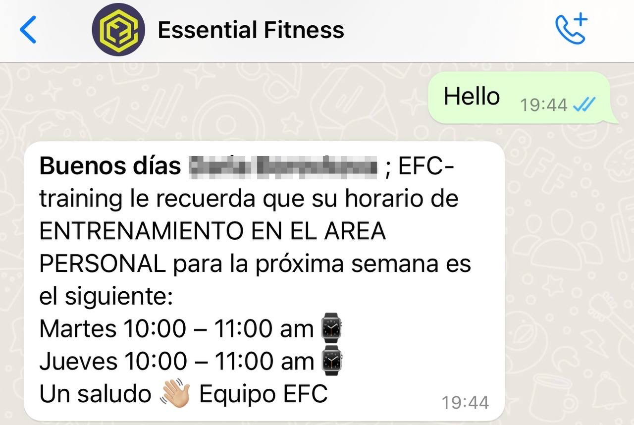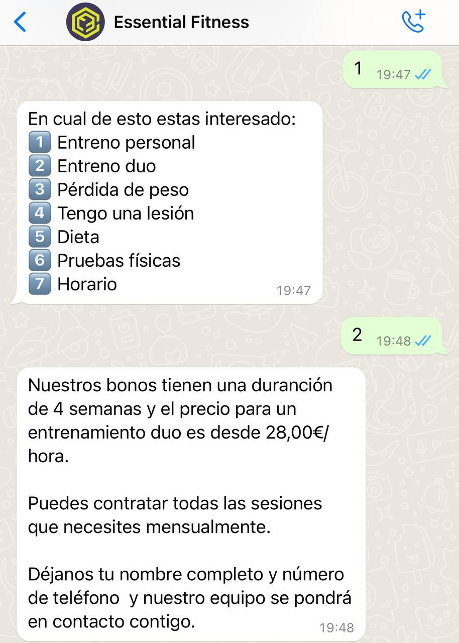 The third bot helps new clients when employees are busy with training and cannot respond promptly. When potential visitors write to WhatsApp, the bot asks them questions and, based on their answers, sends information about the fitness center and services. EFC-Training employees can see all dialogs and join the conversation anytime.